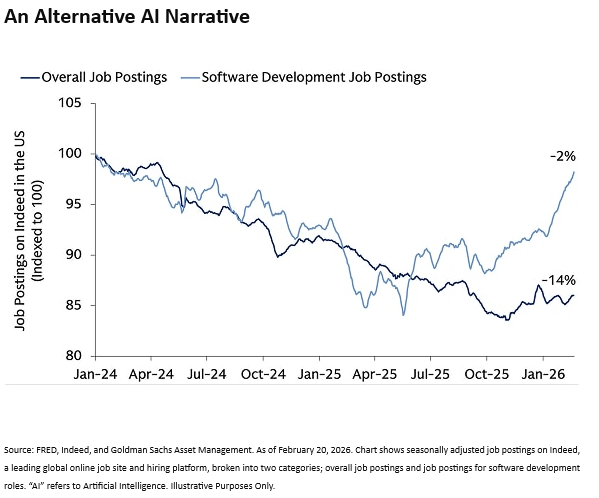 Our long-term optimistic outlook remains intact, which is rooted in a structural productivity boom. We are seeing a 2020s economy driven by technology that enhances human output rather than just replacing it. Despite fears that AI will lead to job losses, software engineer job postings are up 11% year-over-year. Software engineers were thought to be first on the AI disruption chopping block. This suggests that AI is more likely going to be an additive tool than one that replaces large swaths of skilled labor.