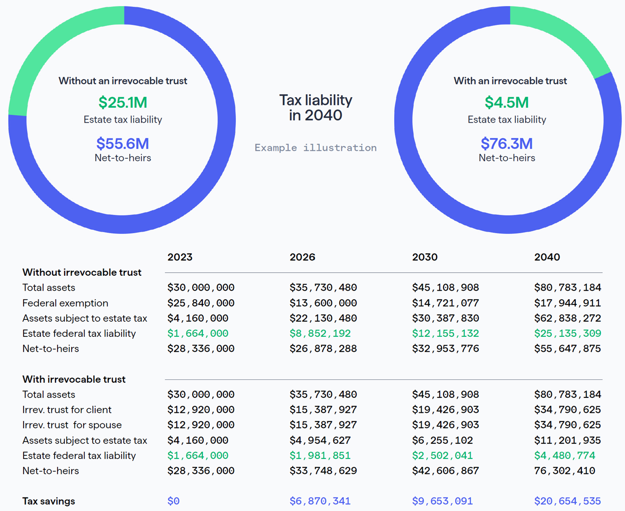 If your estate will be in this range in 2026 – or you think it has the potential to climb into this range in the years to come – you may want to use your exemption before the sunset, while it’s still at a historic high. Now is the time for us to form a strategy as waiting too long to implement it could be costly.