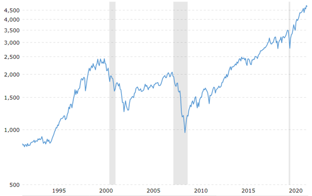 So, that’s the bad news, corrections and bear markets will continue to happen and with great frequency, BUT they are short lived, and markets continue to rise over time, so the prospects of winning in the market long-term are extremely high. In fact, once the bear market ends, the rewards for those who stayed in vested are huge. After bottoming out in March 2009, the S&P 500 shot up by 69.5% in just 12 months. Take a look at the graph below showing the growth in the S&P 500 over the last 30 years. There are plenty of small declines, a few big ones, but overall the trend has been increasingly upward.