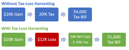 At the end of each calendar year the IRS taxes investors on their capital gains (when an investment is sold at a profit). Investors can offset those gains by “harvesting” other investments by selling them at a loss, instead of holding them with hopes of future profits. By offsetting capital gains with capital losses, investors can minimize or eliminate taxes owed from their investment portfolio. This offsetting dynamic is appliable and interchangeable to both short-term (investments held less than a year) and long-term gains/losses.