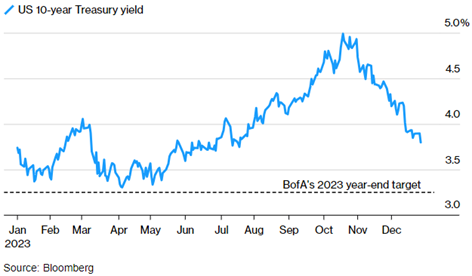 Their forecasts were not unfounded as interest rates took investors for a ride. The global benchmark 10-year U.S. Treasury yield started the year at 3.88%, climbing up to a high of 5.02% in October, then plummeted to end the year at 3.88%. A true rollercoaster, ending right back at the start.