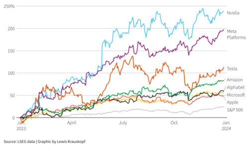 Advancements in artificial intelligence (AI) came strongly to the fore in 2023. Microsoft and other tech giants benefited. Dubbed the “Magnificent Seven,” these companies became market darlings and were the driving force behind the S&P 500 and Nasdaq’s gains.