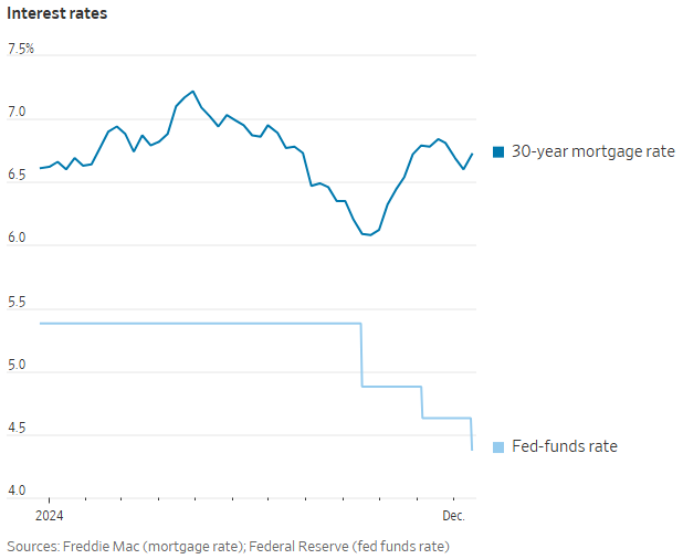 While the Federal Reserve lowered its Fed Funds rate numerous times, long-term interest rates went up including mortgage rates starting on September 17, 2024. Long rates have yet to stop climbing with the 30-year mortgage nearing 7% presently.